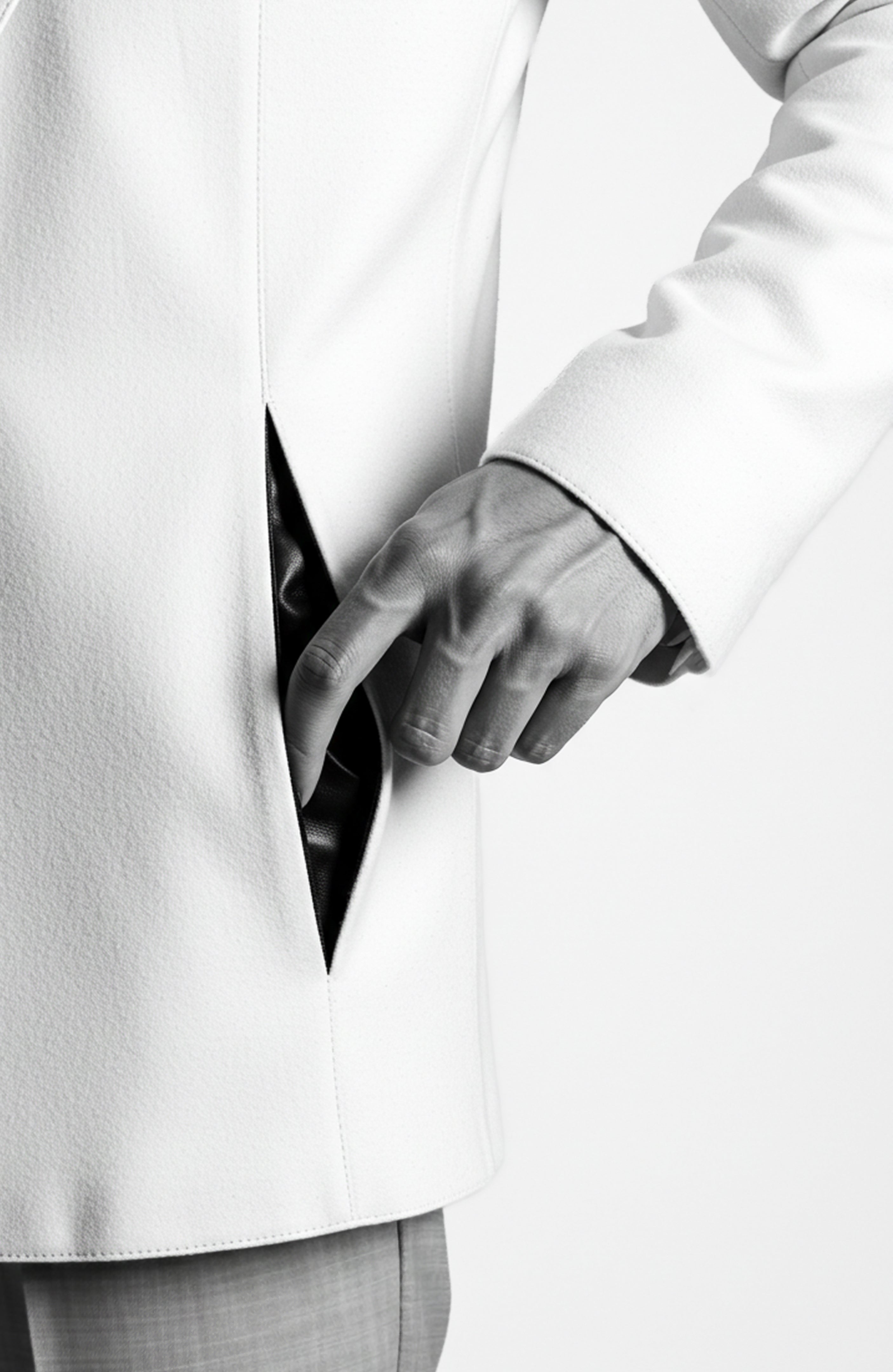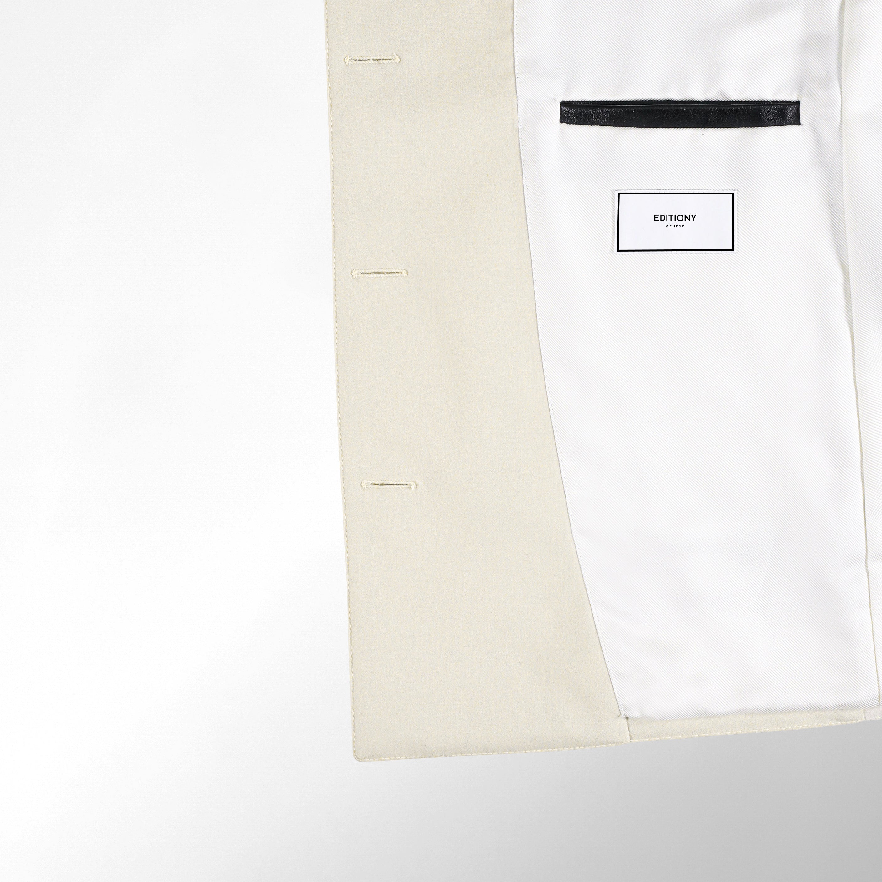 THE HOUSE'S ICONIC ŒUVRE JACKET COMBINES DIAMOND FIBERS, MASTERCRAFTED IN SWITZERLAND IN RARE VIRGIN CASHMERE LINED WITH SPECIAL VIRGIN DOUBLE-SILK. CALFSKIN INSIDE THE SIGNATURE GHOST POCKETS AND UNDERCOLLAR REFINES THE ART OF TOUCH. THE ULTIMATE ALLURE IS WHISPERED FROM THE CUSHION-ROUND HORN BUTTONS POWERFULLY HIGHLIGHTING THE HOUSE CODES.